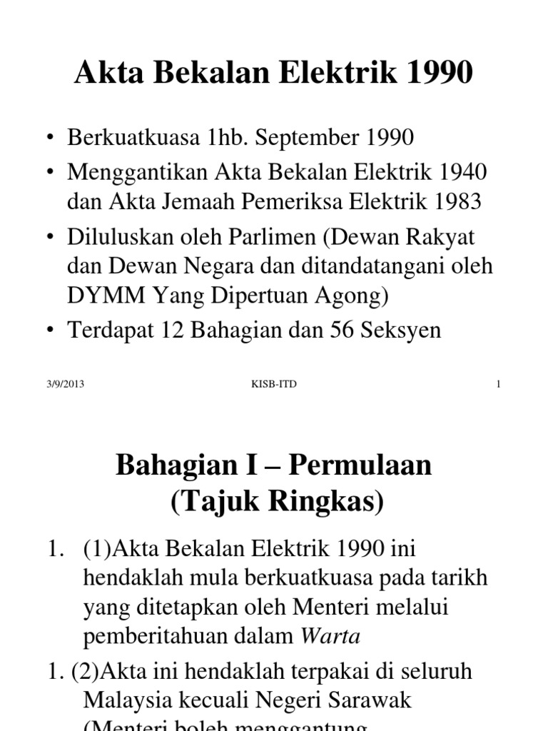 Akta Bekalan Elektrik 1990 Ppt Akta Bekalan Elektrik 1990 U2022 Berkuatkuasa 1hb September 1990 U2022 Menggantikan Akta Bekalan Elektrik 1940 Dan Akta Course Hero