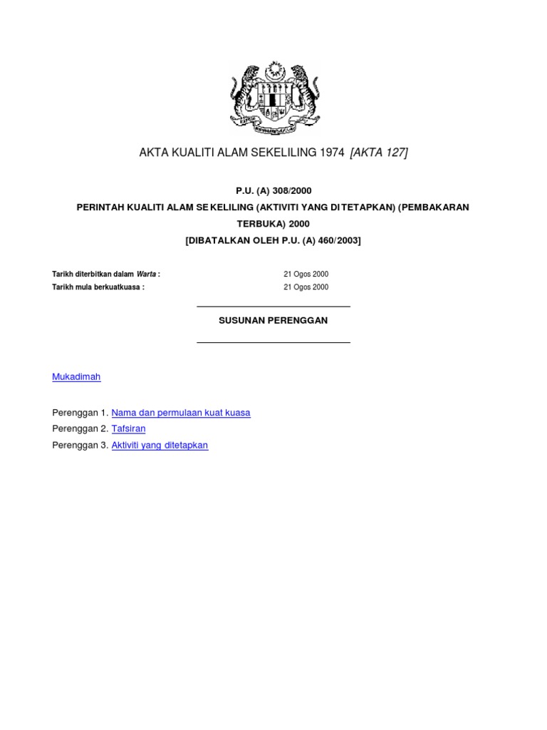 3 Perintah Kualiti Alam Sekeliling Aktiviti Yang Ditetapkan Pembakaran Terbuka 2000 Dibatalkan P U A 308 2000