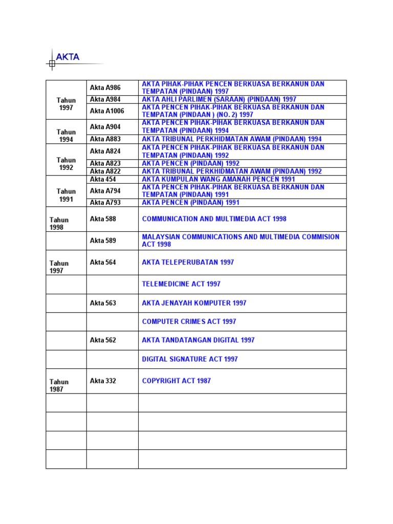 List Of Malaysian Law Acts Senarai Akta Akta Malaysia