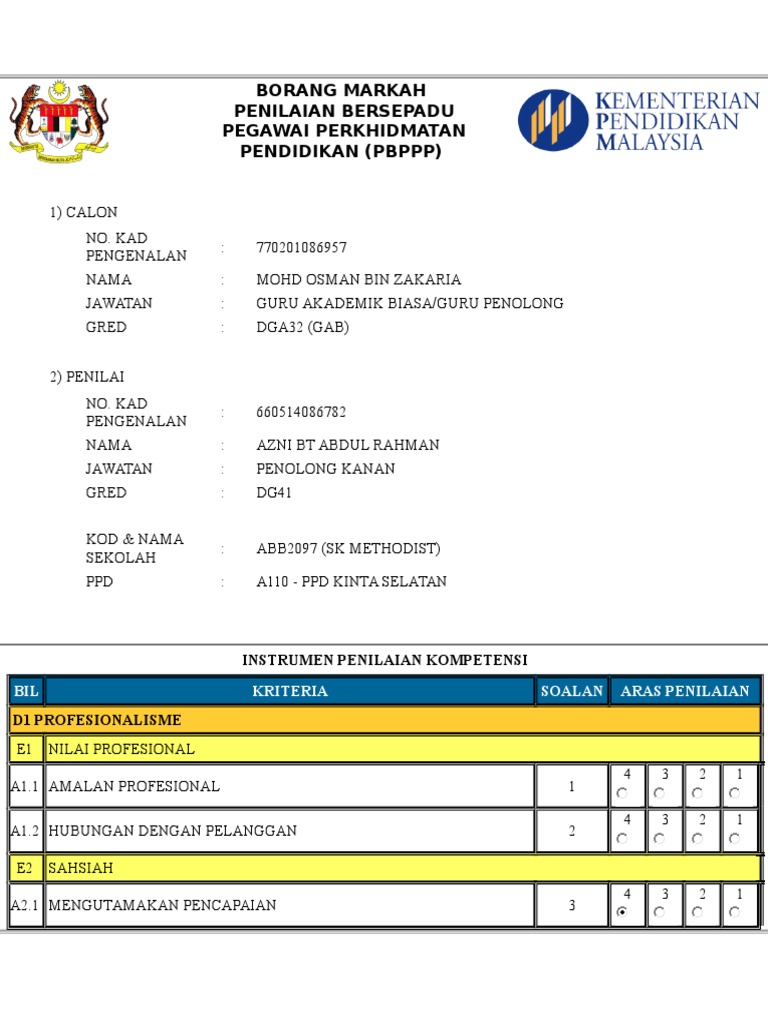 Borang Skor Penilaian Bersepadu Pegawai Perkhidmatan Pendidikan Pbppp Apdm Kehadiran