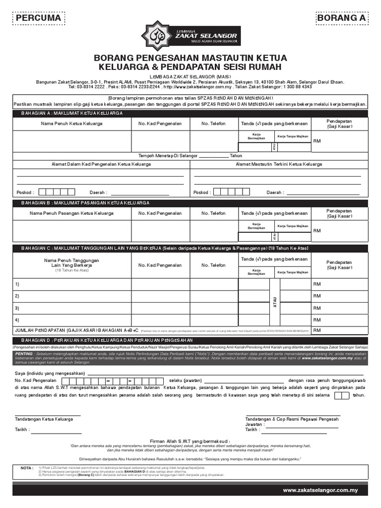Borang A Pengesahan Mastautin Ketua Keluarga Pendapatan Seisi Rumah