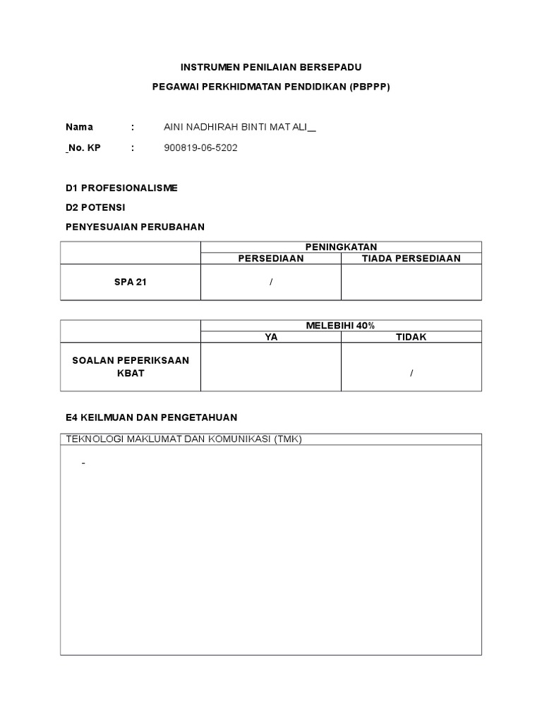 Borang Skor Penilaian Bersepadu Pegawai Perkhidmatan Pendidikan Pbppp Apdm Kehadiran