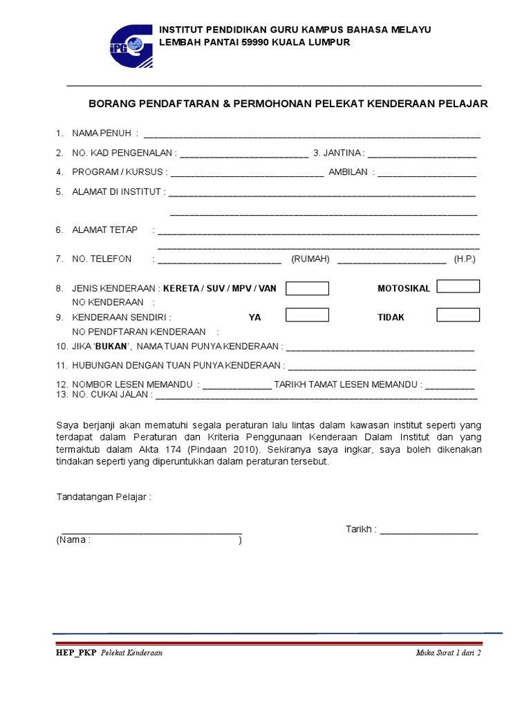Pdf Borang Pendaftaran Kenderaan Pelajar Jerry Khuzairi Academia Edu