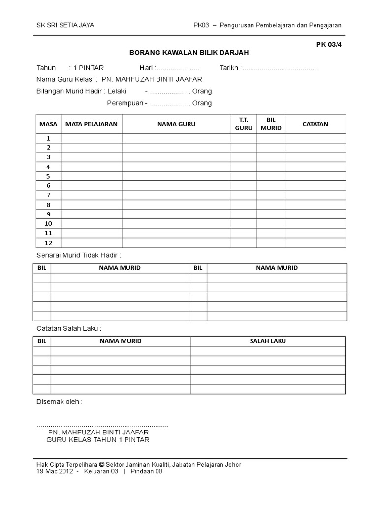 Doc 2 Pk03 4 Borang Kawalan Bilik Darjah 2015 2 Poh Suan Tan Academia Edu