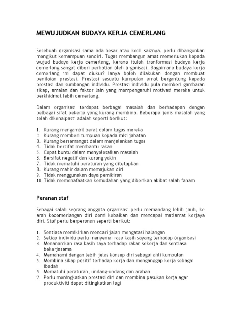 Mewujudkan Budaya Kerja Cemerlang Peranan Staf
