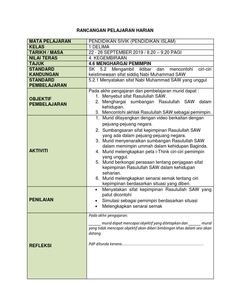 Rancangan Pelajaran Harian Mata Pelajaran Kelas Tarikh Masa Nilai Teras Tajuk 4 6 Menghargai Pemimpin Standard Kandungan Standard Pembelajaran