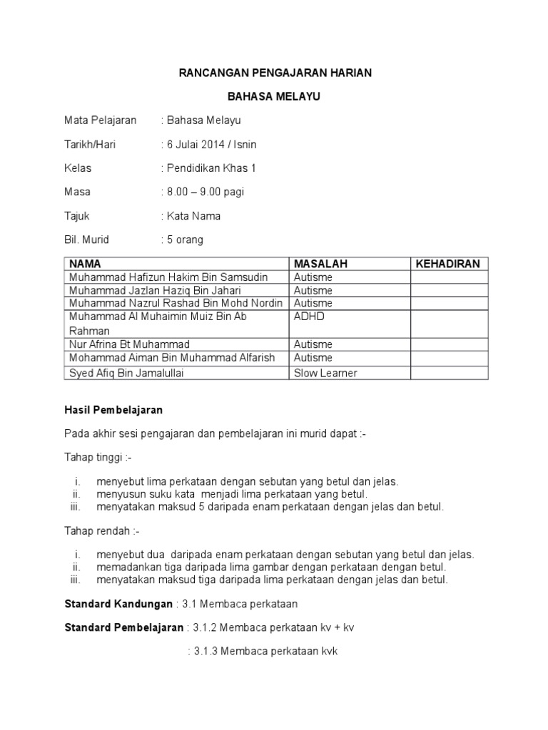 Contoh Rancangan Pengajaran Harian Pendidikan Khas Bahasa Malaysia Suku Kata Kv Kv Kvk