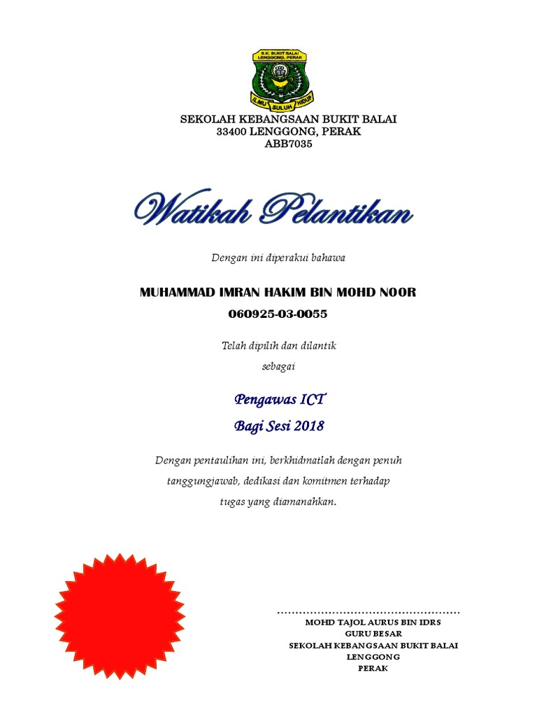 Sijil kehadiran penuh persekolahan. Contoh sijil contoh surat lantikan pengawas. 29 2 2016 pengetua smk taman indah 73000 tampin negeri sembilan. From professional translators enterprises web pages and freely available translation repositories.