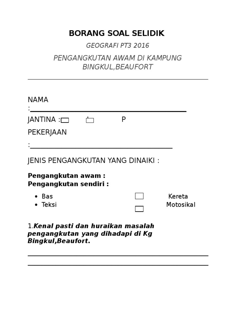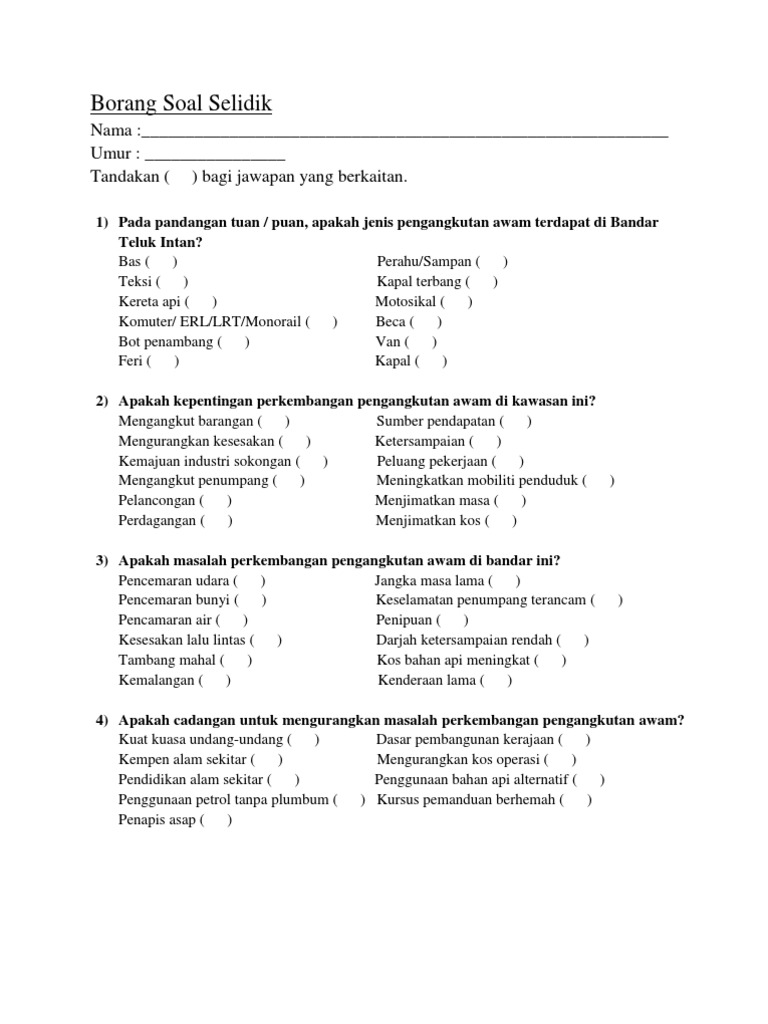 Contoh Soalan Borang Soal Selidik Pengangkutan Awam J Kosong W