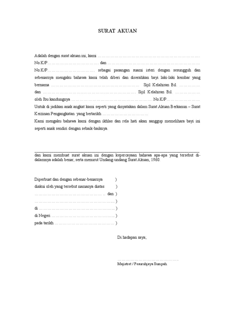 Dan saya membuat surat akuan sumpah ini dengan kepercayaan bahawa apa apa yang tersebut di dalamnya adalah benar serta menurut akta akuan berkanun 1960. Diperbuat oleh. Oleh itu mula mula dapatkan surat akuan berkanun surat keizinan pengangkatan yang dikeluarkan oleh jpn. Pembuktian boleh dibuat melalui surat keizinan ibu bapa kandung iaitu akuan berkanun yang dibuat oleh ibu bapa kandung semasa proses penyerahan kanak kanak tersebut kepada ibu bapa angkat.