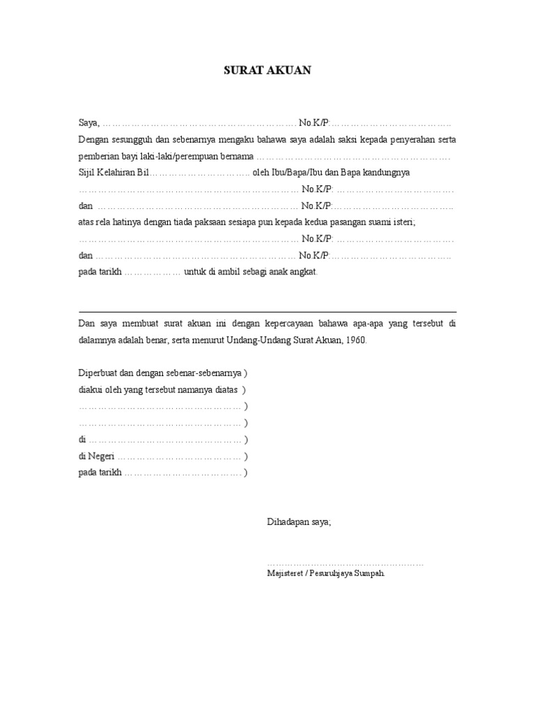 Contoh surat akuan berkanun anak angkat. Dibuat dan dengan sebenar benarnya diakui oleh. Contoh surat akuan keizinan mengambil anak angkat posted on 29 05 2012 30 comments salam buat anda dan terima kasih kerana sudi melihat blog ini jadi saya hanya membantu anda yang sedang mencari cari borang atau surat akuan anak angkat anda boleh salin untuk kesenangan anda berurusan mudah dan murah sikitkan kos kerja anda buatlah copy. Bila ingin mendownload contoh surat mou dalam format. Contoh surat permohonan pertukaran.