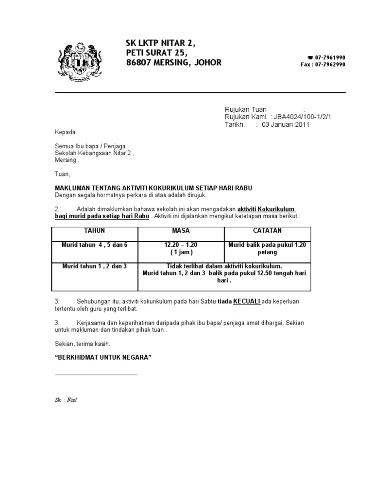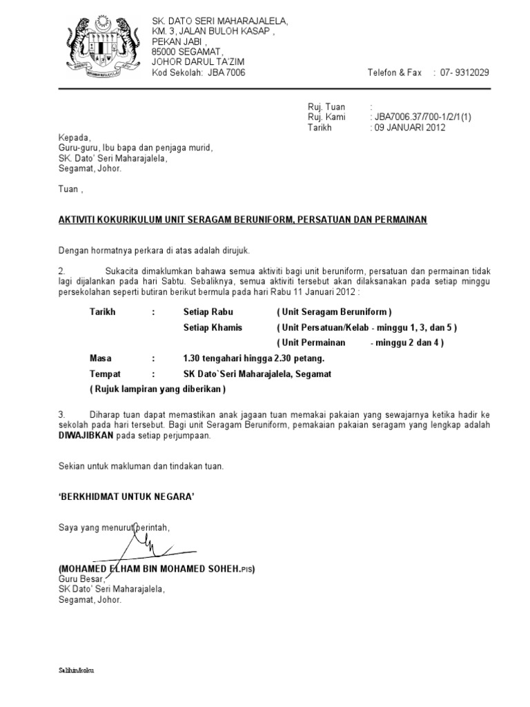 Contoh Surat Makluman Aktiviti Kokurikulum Kepada Ibu Bapa