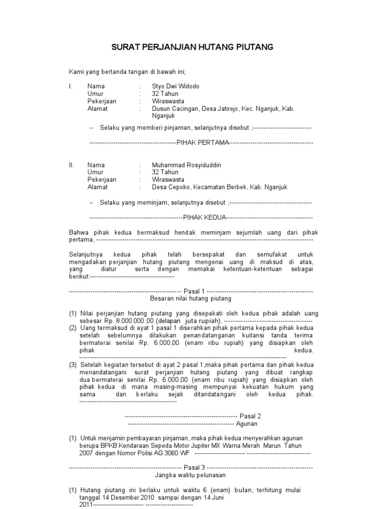 Contoh Surat Perjanjian Hutang Piutang Sederhana Dengan Jaminan Bermaterai Surat Kata Kata Indah Buku Mewarnai
