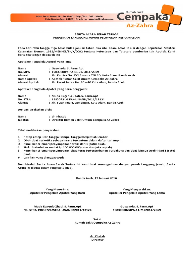 Berita Acara Serah Terima Peralihan Tanggung Jawab Penanggungjawab Apoteker