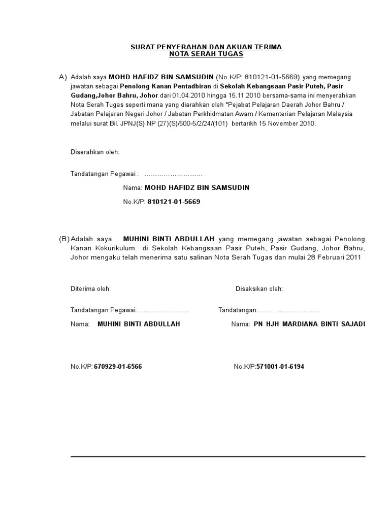 Contoh Nota Serah Tugas Kakitangan Awam Guru