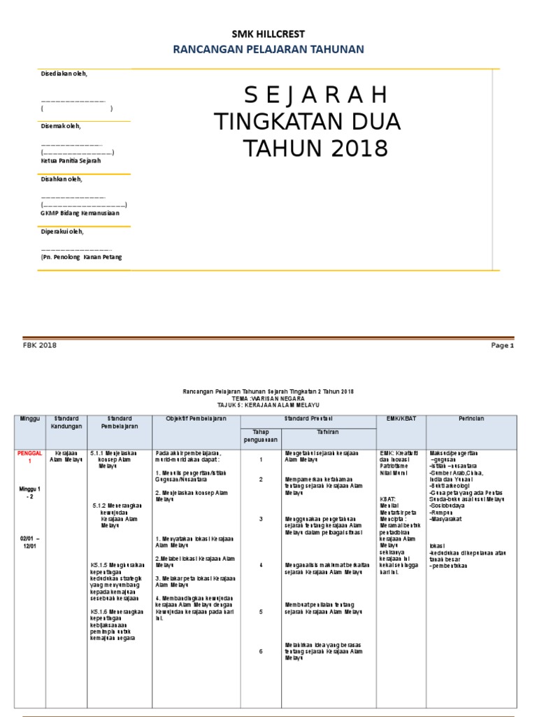 Doc Rancangan Pelajaran Tahunan Sejarah Tingkatan 2 Tahun 2018 Tema Warisan Negara Tajuk 5 Kerajaan Alam Melayu Halim Afif Academia Edu