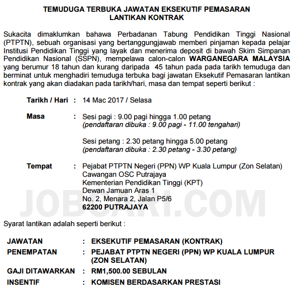 Temuduga Terbuka Di Ptptn Gaji Rm1 500 00 Jobcari Com Jawatan Kosong Terkini